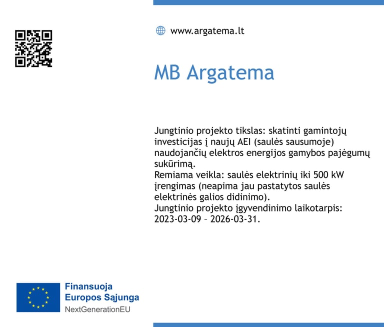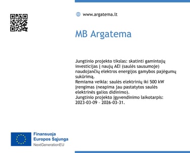Galimybė gauti paramą iš jungtinio projekto „Investicinė parama saulės elektrinėms sausumoje“ pateikus paraišką Lietuvos energetikos agentūrai paskatino MB "Argatema" suplanuoti įsirengti saulės elektrinę sausumoje.